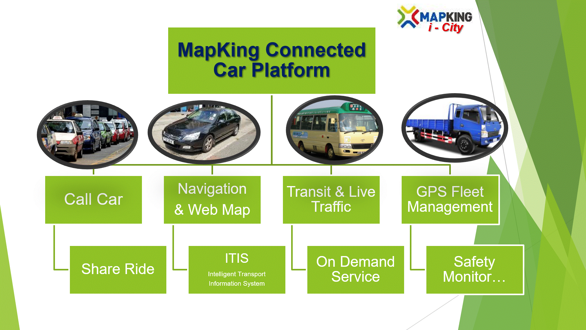 “MapKing Intelligent Transport Information System (MapKingITIS) and Connected Navigation” is our award-winning intelligent transport information system (ITIS) platform featuring real-time traffic information feeds from official MapKing services, open data, web resources, and community-sharing channels. By virtue of wireless communication link to our cloud-based servers, live traffic information is deployed to yield better navigation cues and improved passenger experience by providing planned or ad-hoc traffic incidents and road closure information.